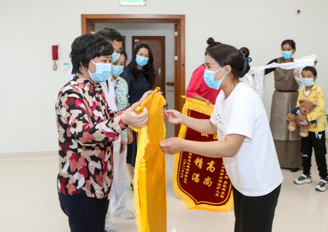 鄧?yán)蚋敝魅我恍锌赐藖碛逯委煹?5位患兒,并為他們送上嶄新的書包和文具。并與患兒家長(zhǎng)熱情交談,詳細(xì)了解患兒恢復(fù)情況。患兒家屬代表卓瑪和旺姆分別向重慶市衛(wèi)健委和重醫(yī)附屬兒童醫(yī)院贈(zèng)送了錦旗,并獻(xiàn)上了潔白的哈達(dá)表示感謝。