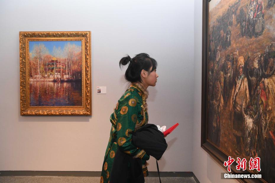 9月26日,“第四屆雪域情西藏油畫展”在西藏自治區(qū)自然科學(xué)博物館舉辦。此次油畫展共展出入選作品80余幅,展期為10天。圖為一名參觀者在觀看作品。 中新社記者 貢嘎來松 攝