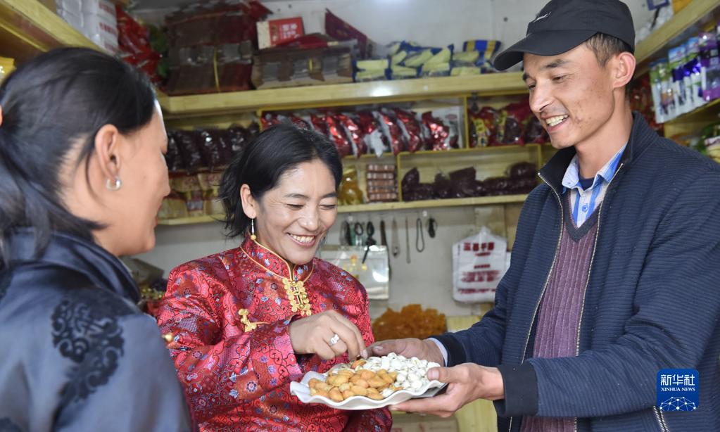 阿卜杜杰力力·麥提如剛(右)于2010年從新疆和田墨玉縣來到西藏阿里獅泉河鎮(zhèn)做干果生意,并融入到獅泉河鎮(zhèn)藏布居委會的民族大家庭中。圖為阿卜杜杰力力·麥提如剛請當?shù)夭刈迮笥哑穱L來自家鄉(xiāng)的特產(9月22日攝)。新華社發(fā)(索朗羅布 攝)
