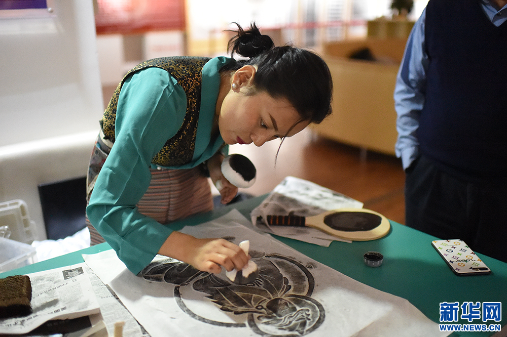 9月29日,在西藏大學新校區(qū)圖書館,日喀則石刻藝術博物館專業(yè)傳拓員德吉白珍演示拓片制作過程。新華網 旦增努布 攝