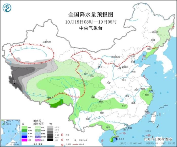 10月17日08時(shí)至18日08時(shí),內(nèi)蒙古東北部、新疆南疆西部山區(qū)等地部分地區(qū)有小到中雪,其中,西藏西部等地部分地區(qū)有大雪(5~7毫米)。海南島等地部分地區(qū)有中到大雨,其中,海南島東南部等地部分地區(qū)有暴雨(50~80毫米)。內(nèi)蒙古中部、西藏北部等地部分地區(qū)有4~5級(jí)風(fēng)(見圖1)。