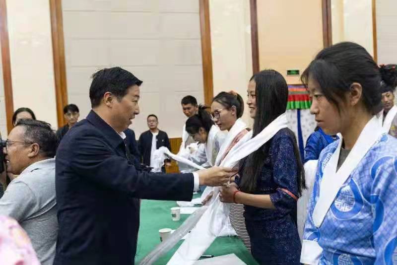 10月14日下午,湖北省第九批援藏工作隊領(lǐng)隊、山南市委副書記、常務副市長李修武為即將赴湖北就業(yè)的大學生獻哈達。(通訊員 羅洋 攝)