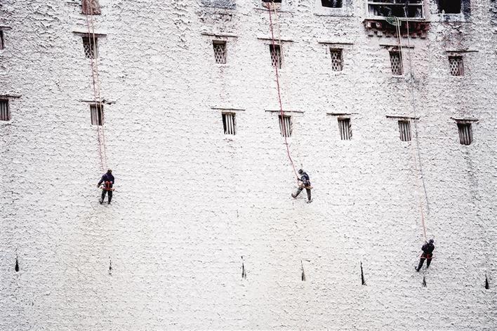 據(jù)悉,工作人員要先對涂料進行過濾,然后再進行噴灑。而人力無法抵達的地方則由專業(yè)人員化身“蜘蛛人”用涂料噴槍進行粉刷。在高空作業(yè)的“蜘蛛人”是經(jīng)過培訓(xùn)的特定人員,“蜘蛛人”懸掉在空中,并有專人負責拉繩,大家齊心協(xié)力完成粉刷工作。