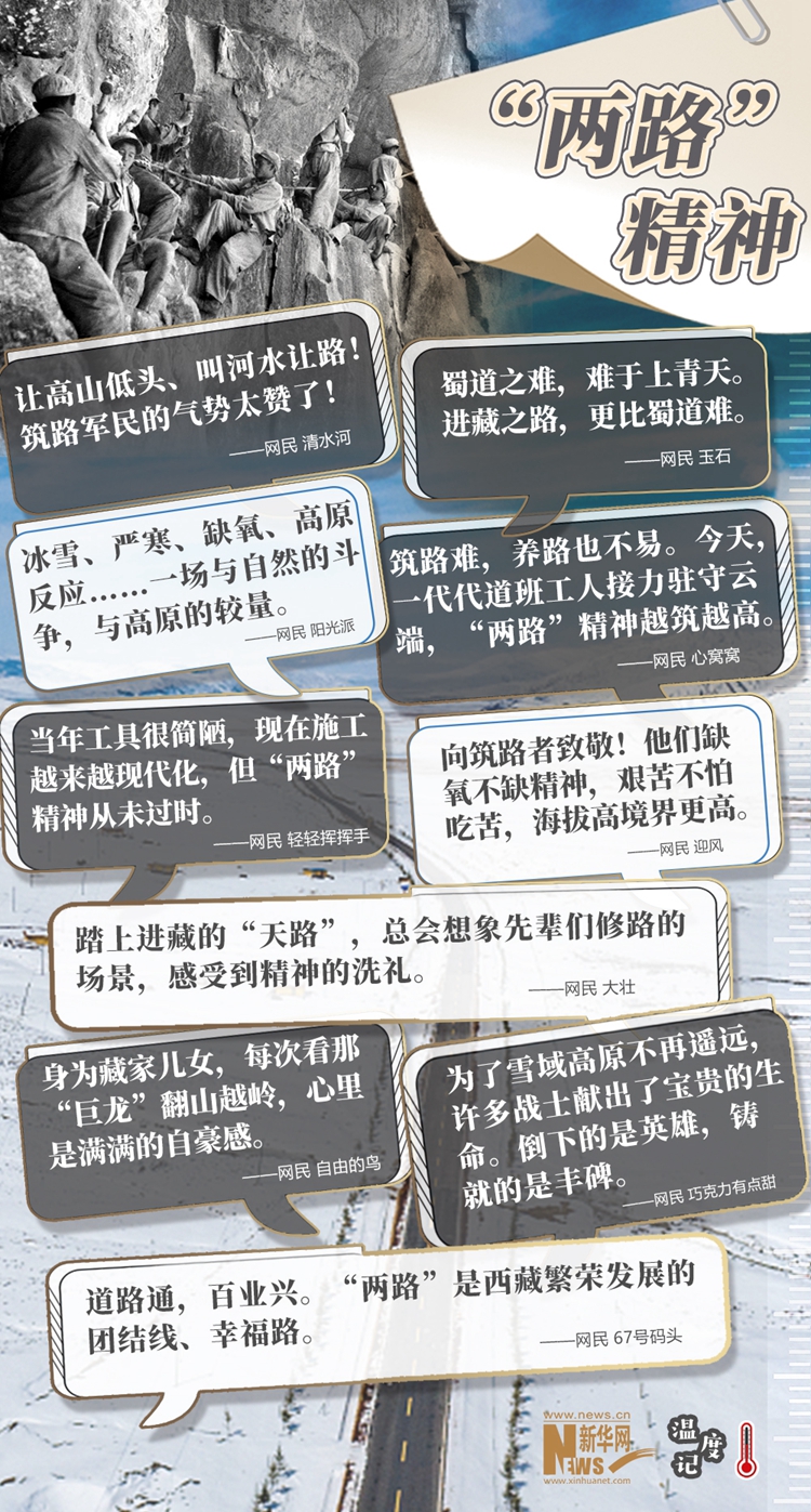 “天路”巍峨,精神閃光。當雪域高原換了人間,新一代建設者正接過接力棒,在新時代續(xù)寫著新的傳奇?!敖裉欤淮腊喙と私恿︸v守云端,‘兩路’精神越筑越高”,正如網(wǎng)民所說,無論過去、現(xiàn)在和將來,“兩路”精神都是西藏各族人民建設幸福家園的力量源泉和精神動力,也必將激勵中華兒女為了更加美好的明天繼續(xù)奮斗、前行。(文字:馬若虎 海報設計:王曄)