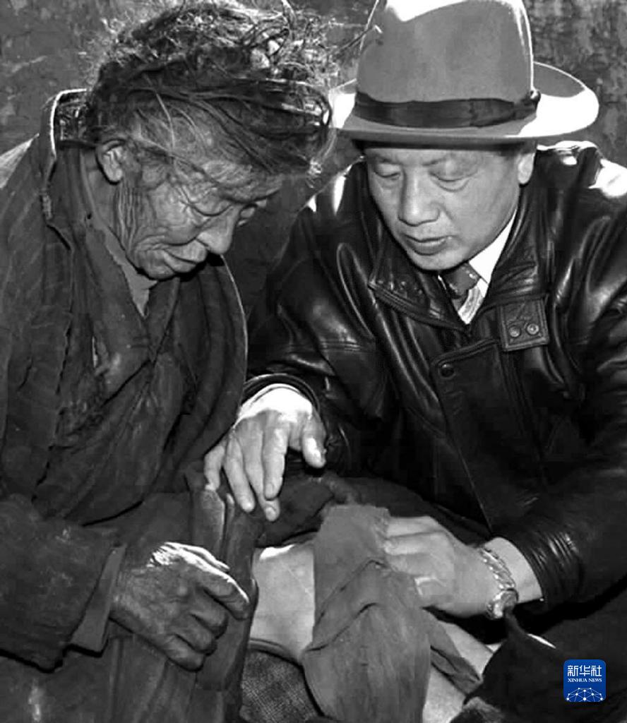 孔繁森(右)在西藏阿里日土縣過巴鄉(xiāng)看望孤寡老人益西卓瑪(資料照片)。新華社發(fā)