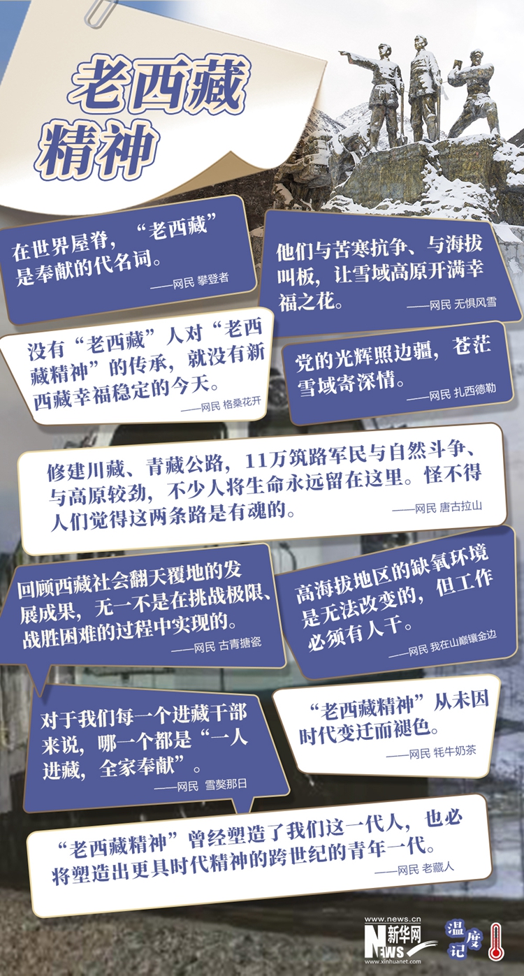 此后的幾十年間,一批又一批、一代又一代援藏干部、駐藏官兵踏上世界屋脊,扎根雪域高原,和當(dāng)?shù)厝罕娨坏溃苿游鞑馗黜?xiàng)事業(yè)又快又好發(fā)展,讓千年雪域高原變了樣,也賦予“老西藏精神”更為豐富的時代內(nèi)涵?!吧谶@里很脆弱,生命在這里也很頑強(qiáng)?!本W(wǎng)民們在社交平臺上表達(dá)對雪域高原心向往之的同時,更不忘歌頌歷久彌新的“老西藏精神”。歷經(jīng)時代的變遷,這種精神正在感召并鼓舞更多人,扎根邊疆,造福西藏,讓那里的山水永遠(yuǎn)碧藍(lán)、綺麗,讓那里的土地永遠(yuǎn)充滿希望、幸?;ㄩ_。(文字:徐可 海報設(shè)計:王曄)