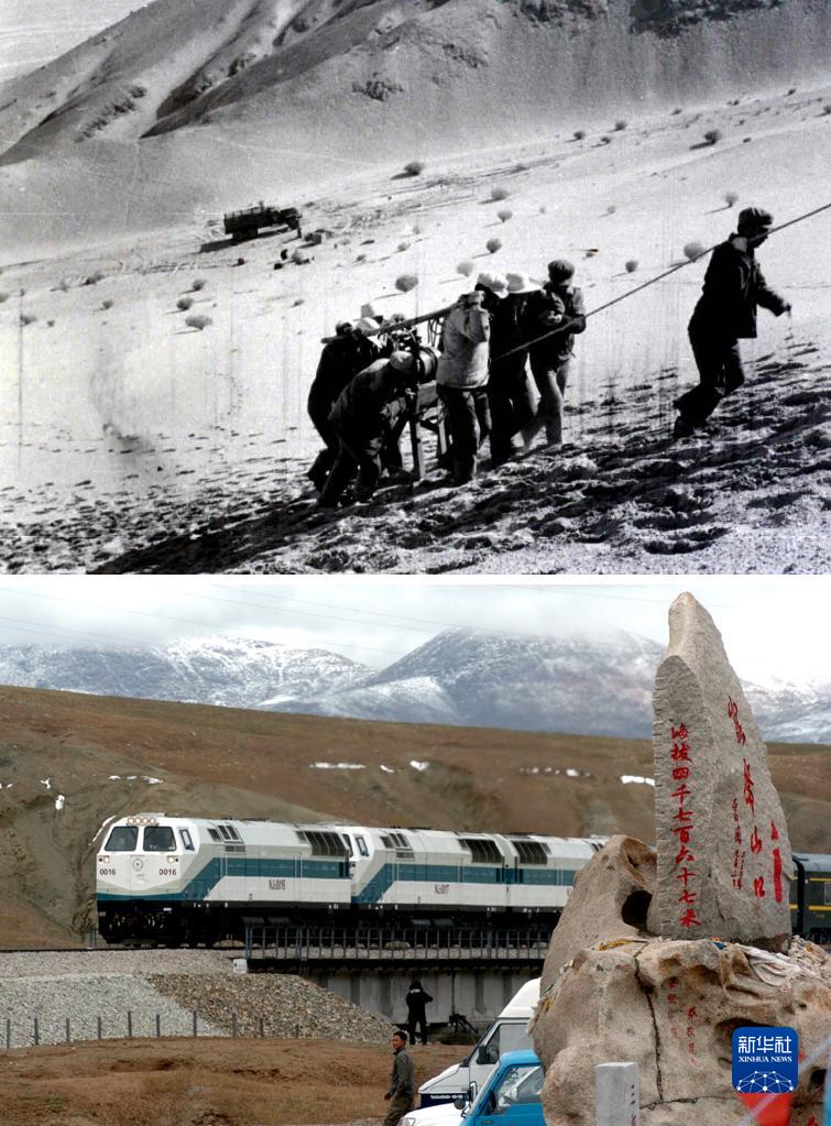 拼版照片:上圖為20世紀(jì)50年代拍攝的勘測青藏線的資料照片;下圖為2006年7月1日,青藏鐵路全線通車。這是從格爾木出發(fā)的“青1”次列車經(jīng)過海拔4767米的昆侖山口(新華社記者侯德強(qiáng)攝)。新華社發(fā)