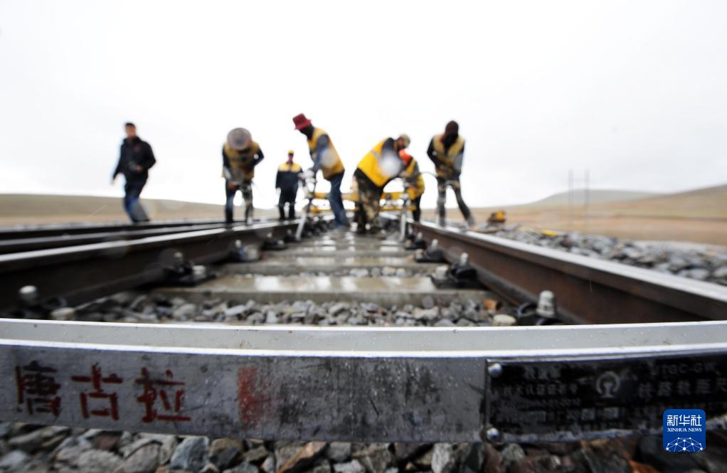 2018年6月30日,在青藏鐵路唐古拉站附近,養(yǎng)路工人冒雨對路軌進(jìn)行搗固作業(yè)。新華社記者 侯德強(qiáng) 攝