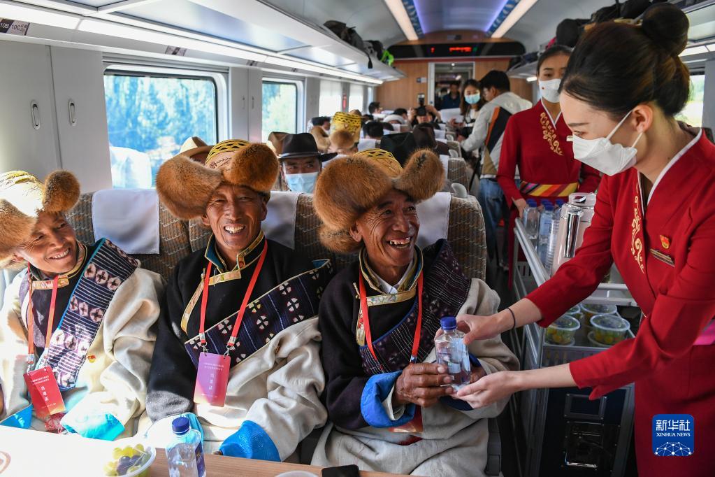 2021年6月25日,全長435公里、設(shè)計時速160公里的拉林鐵路建成通車,西藏首條電氣化鐵路建成,同時復(fù)興號實(shí)現(xiàn)對31個省區(qū)市全覆蓋。這是6月25日列車員向乘坐首趟復(fù)興號高原內(nèi)電雙源動車組的乘客遞水。新華社記者 普布扎西 攝