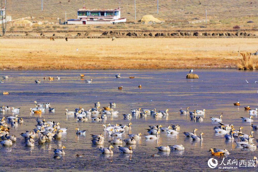 近年來,西藏不斷加大野生動(dòng)物保護(hù)力度,維護(hù)生物多樣性,越冬水鳥種群數(shù)量呈逐年上升趨勢(shì)。西藏中南部“一江三河”流域的河谷、農(nóng)田是越冬水鳥的主要夜宿地和覓食地。今年年初,西藏自治區(qū)高原生物研究所在該流域開展了越冬水鳥的監(jiān)測(cè)工作,共記錄越冬水鳥42種,17萬(wàn)余只,其中絕大部分為冬候鳥。在數(shù)量方面,以斑頭雁和赤麻鴨為代表的農(nóng)田活動(dòng)水鳥為主,斑頭雁數(shù)量超過10萬(wàn)只。此外,國(guó)家一級(jí)保護(hù)動(dòng)物黑頸鶴的種群數(shù)量維持在8600只以上。