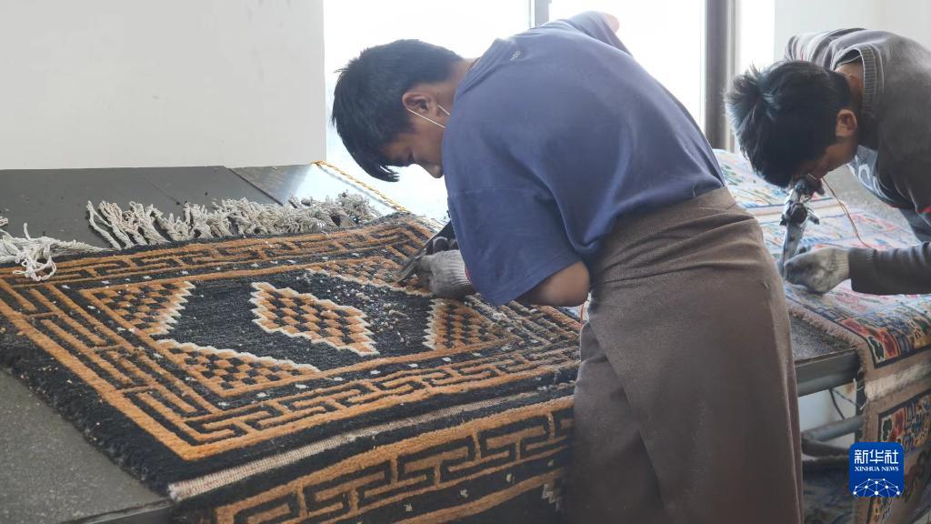 江孜昵煒藏毯廠工人正在對(duì)卡墊進(jìn)行修剪。(2021年10月29日)新華社記者洛卓加措 攝