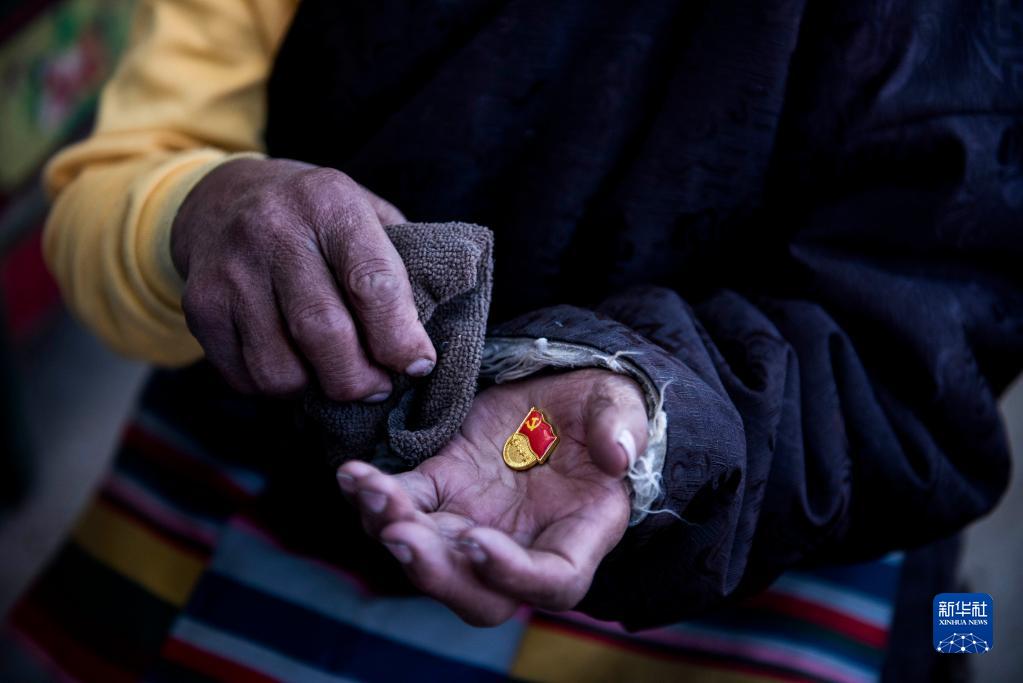 次旦老人手里握著黨徽,小心擦拭(1月31日攝)。新華社記者 格桑朗杰 攝