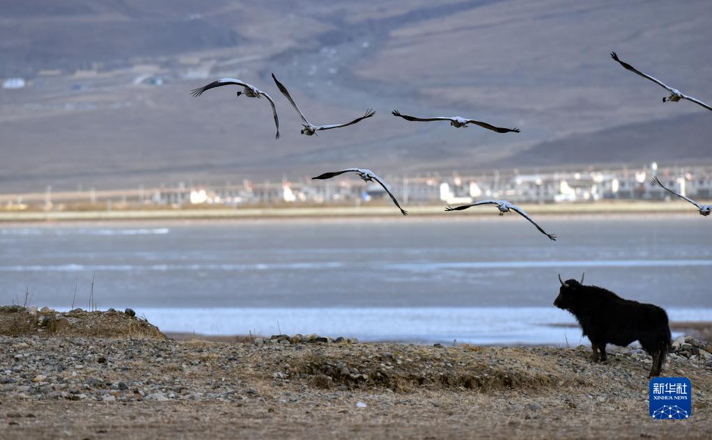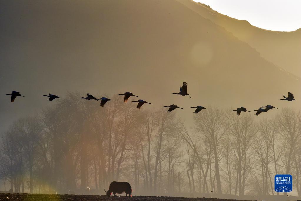 黑頸鶴在拉薩市林周縣黑頸鶴自然保護(hù)區(qū)飛翔(1月9日攝)。新華社記者 黃豁 攝