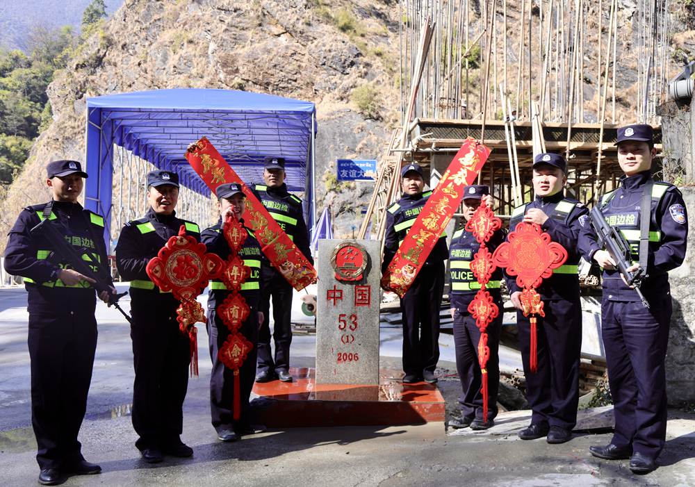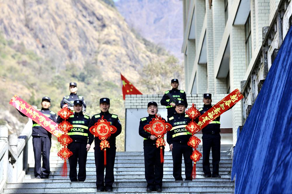 中尼友誼橋執(zhí)勤點民警向全國人民拜年。索朗次仁攝