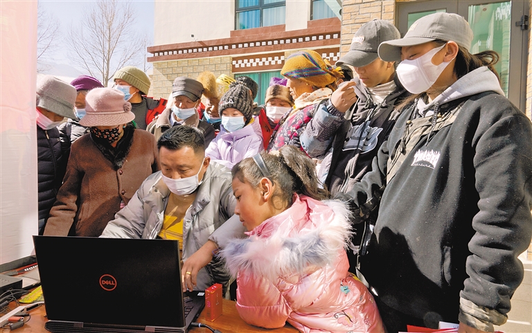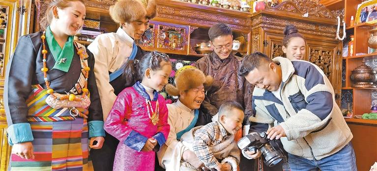 “來,大家看這里!”“咔嚓”一聲,相機定格了鏡頭前旦巴一家四口的笑容。在藏歷新年來臨之際,墨竹工卡縣甲瑪鄉(xiāng)赤康村村民身穿節(jié)日盛裝,等待著專業(yè)攝影師免費拍攝、現(xiàn)場打印全家福照片,留住與家人歡聚一堂的溫馨時刻。
