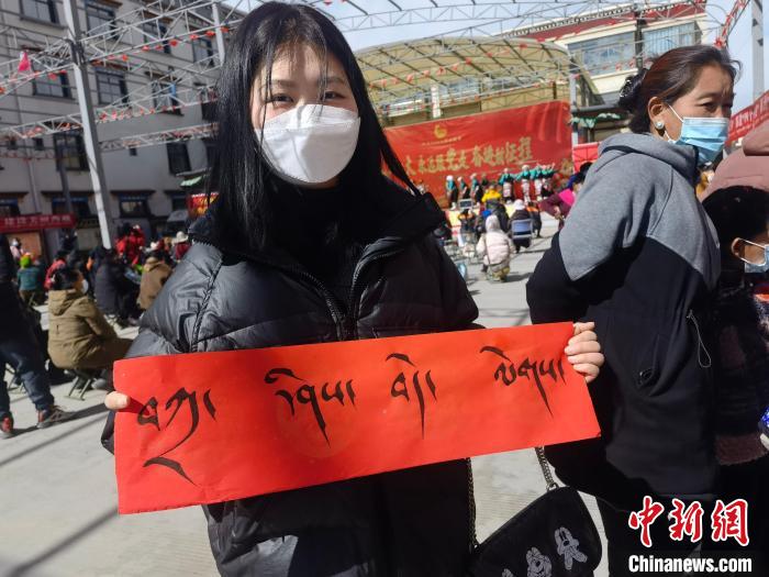 圖為青少年展示藏文對聯(lián)"扎西德勒"?!」睬鄨F西藏自治區(qū)委員會供圖