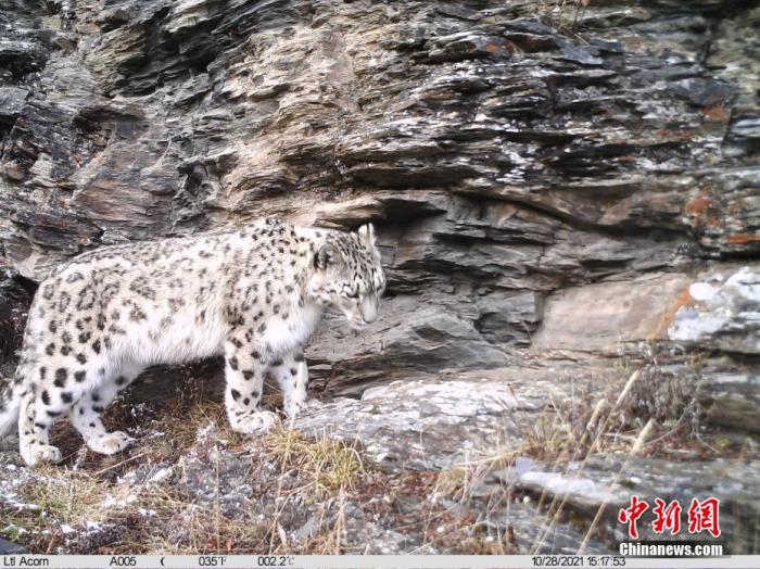 資料圖為2021年10月28日在西藏自治區(qū)丁青縣境內(nèi)由紅外相機(jī)拍攝到的雪豹活動影像。 中新社發(fā) 山水自然保護(hù)中心 供圖