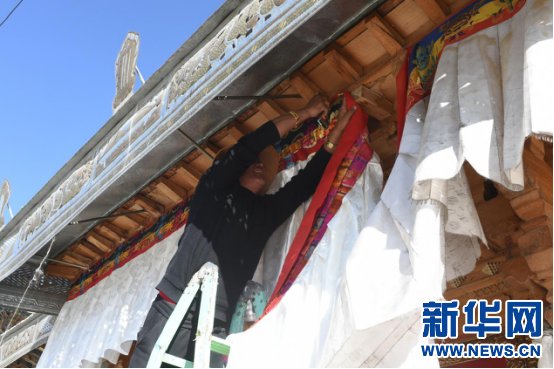 3月2日,乃東區(qū)郭沙村村民巴桑在更換大門的香布(一種藏式裝飾)。新華網(wǎng) 旦增努布 攝