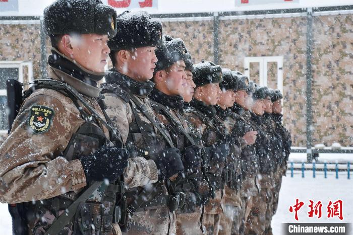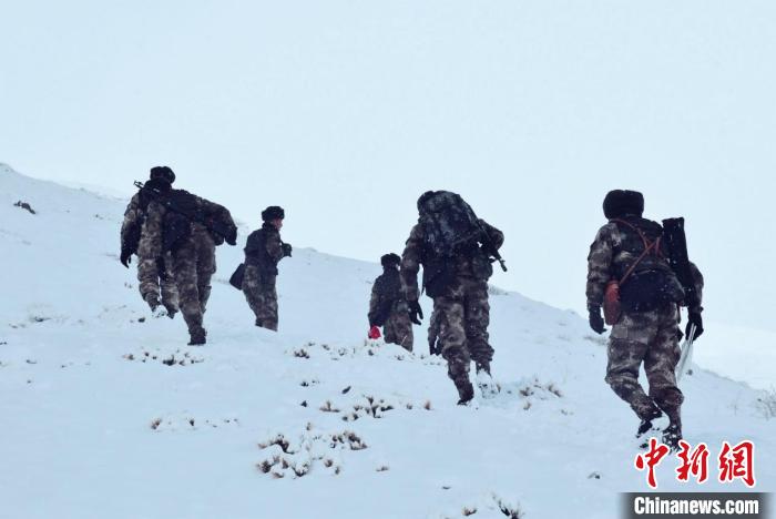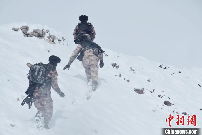 由于道路積雪較厚,車輛無法通行。官兵們采取徒步方式向點位前行,巡邏分隊在風雪中艱難前行,隨著海拔的逐漸增加,氧氣愈發(fā)稀薄,此時的氣溫已經(jīng)接近零下30攝氏度。