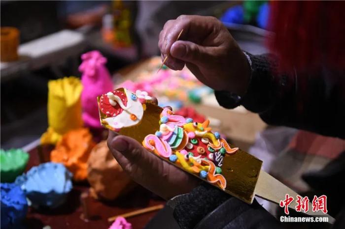 2022年2月14日,酥油花手工藝人在拉薩八廓古城現(xiàn)場(chǎng)制作。藏歷新年臨近,酥油花在年貨市場(chǎng)熱銷(xiāo)。酥油花在藏語(yǔ)中稱(chēng)為“孜扎”,是古時(shí)藏傳佛教信眾因冬季沒(méi)有鮮花供佛而發(fā)明的替代品,如今已是藏族老百姓家庭中必備的年貨之一。中新社記者 貢嘎來(lái)松 攝