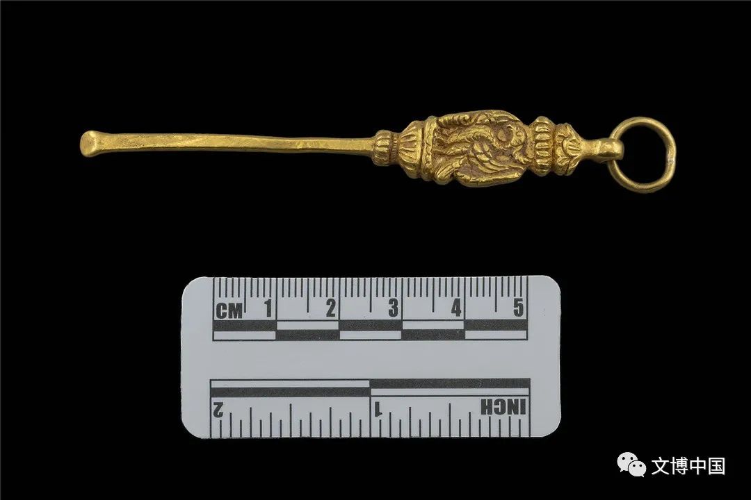 大型墓葬被盜擾情況較為嚴(yán)重,僅結(jié)構(gòu)保存較好,出土遺物普遍較少,小型墓葬未見明顯的盜擾痕跡,但隨葬品極少。出土遺物主要有金銀器,包括雄獅鳥紋金耳勺、植物紋金飾件、銅鍍金覆面、陰刻花紋銀飾件、銀帶扣和金珠、銀珠等;狗頭金;青金石、瑪瑙、珊瑚、松石、珍珠等飾件;陶器(陶片),包括1件鴨嘴流單耳平底罐和若干彩繪赭面人物形象的陶片,屬青藏高原首次發(fā)現(xiàn);銅器,包括銅鏡、銅鈴、銅杯、銅勺、銅錐狀器等;鐵器殘件,可辨器型有鐵箭鏃等;漆皮殘片;貝類制品;紡織物;擦擦;石質(zhì)黑白圍棋子等。
