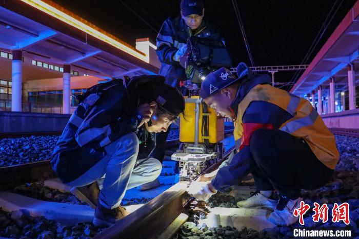 工人夜間對拉林鐵路鋼軌進(jìn)行病害檢測?!±痛稳?攝