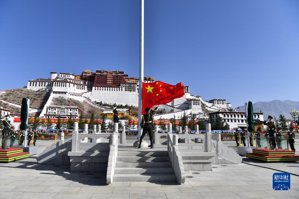 上午10時,隨著《義勇軍進(jìn)行曲》的響起,五星紅旗在布達(dá)拉宮廣場迎風(fēng)飄揚(yáng)。大家肅穆而立,向著國旗行注目禮。