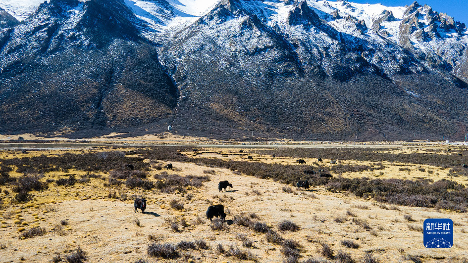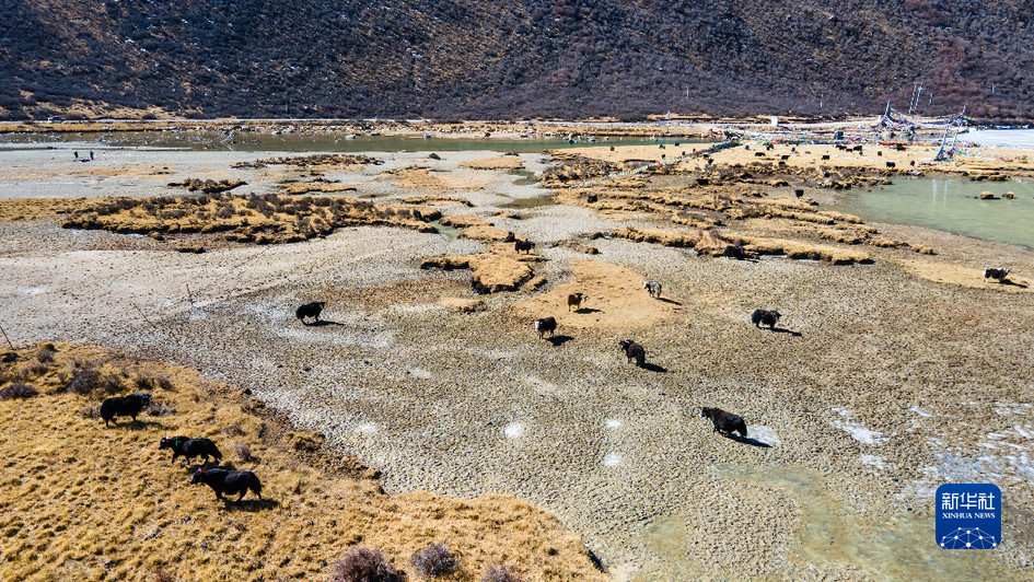 西藏娘亞牦牛養(yǎng)殖產(chǎn)業(yè)發(fā)展有限責(zé)任公司的牦牛在牧場(chǎng)上活動(dòng)(3月30日攝,無人機(jī)照片)。新華社記者 周荻瀟 攝