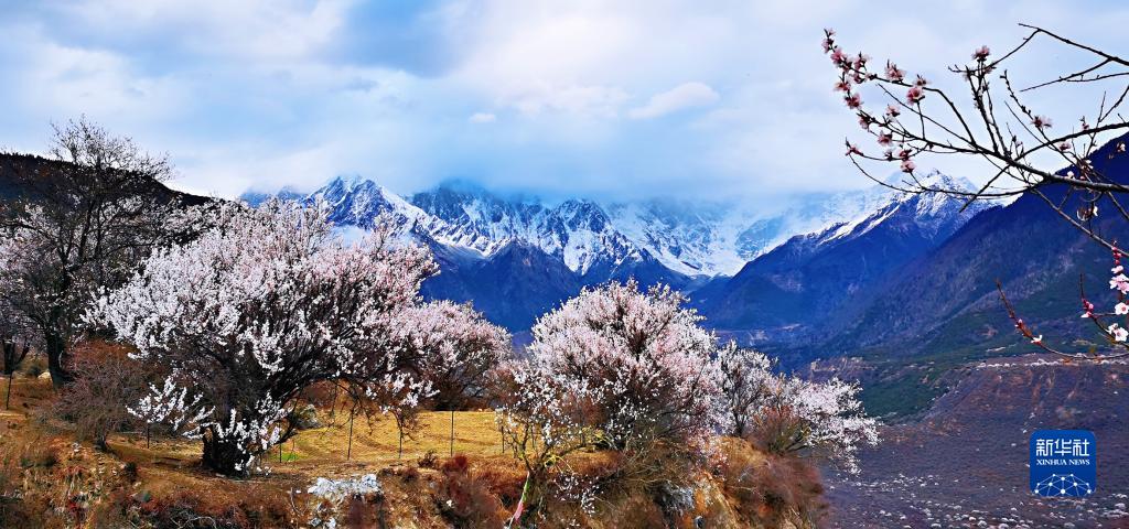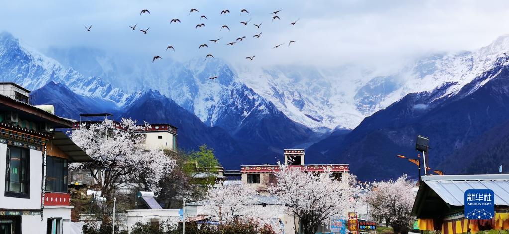 雅魯藏布江河谷一路桃花盛開,和雪山相映成趣。圖為米林縣索松村遠(yuǎn)眺南迦巴瓦峰。新華社記者 沈虹冰 攝