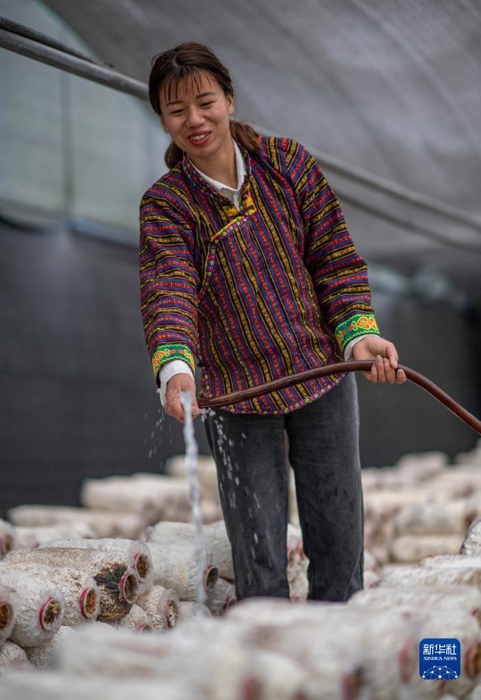 次仁拉珍在給菌棒澆水(4月14日攝)。