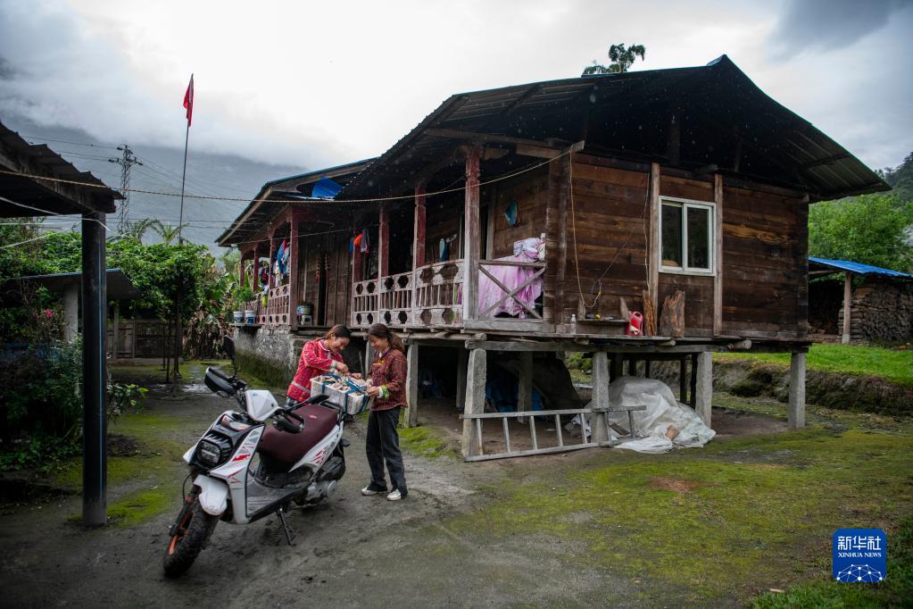 明珠措姆準備騎摩托車前往市場,銷售剛采摘的平菇(4月14日攝)。