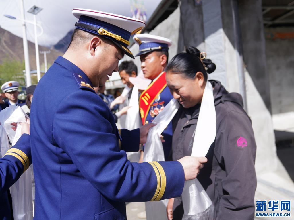 西藏林芝市朗縣洞嘎鎮(zhèn)聶村村民夾道歡迎榮立三等功的消防員洛桑頓珠(4月15日攝)。(李國燾攝 新華網(wǎng)發(fā))