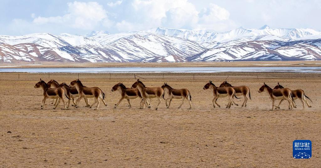4月22日,藏野驢在西藏阿里地區(qū)普蘭縣境內(nèi)雪山下活動(dòng)。新華社發(fā)(劉曉東攝)