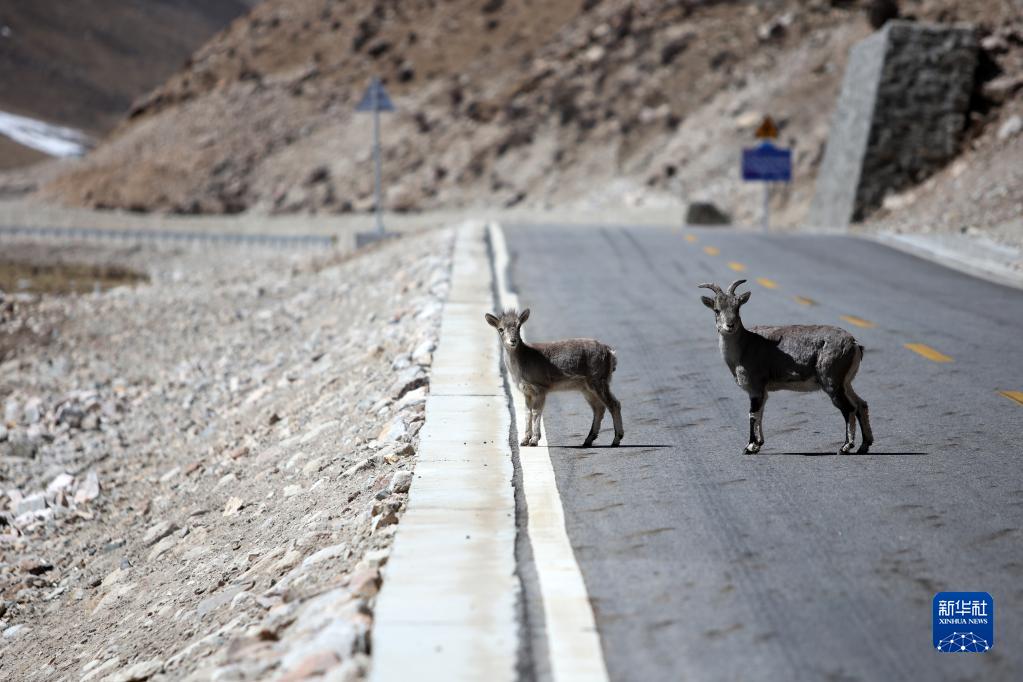 兩只巖羊在拉薩市當雄縣的鄉(xiāng)村道路上(3月27日攝)。新華社記者 姜帆 攝