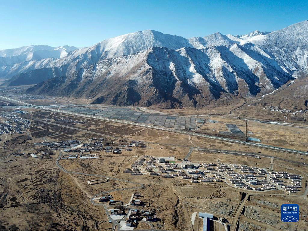 這是拉薩市堆龍德慶區(qū)古榮鎮(zhèn)榮瑪高海拔生態(tài)搬遷點的全景,高速公路、國道、鄉(xiāng)村道路使搬遷點與外面的世界連接通暢(無人機照片,2月28日攝)。新華社記者 姜帆 攝