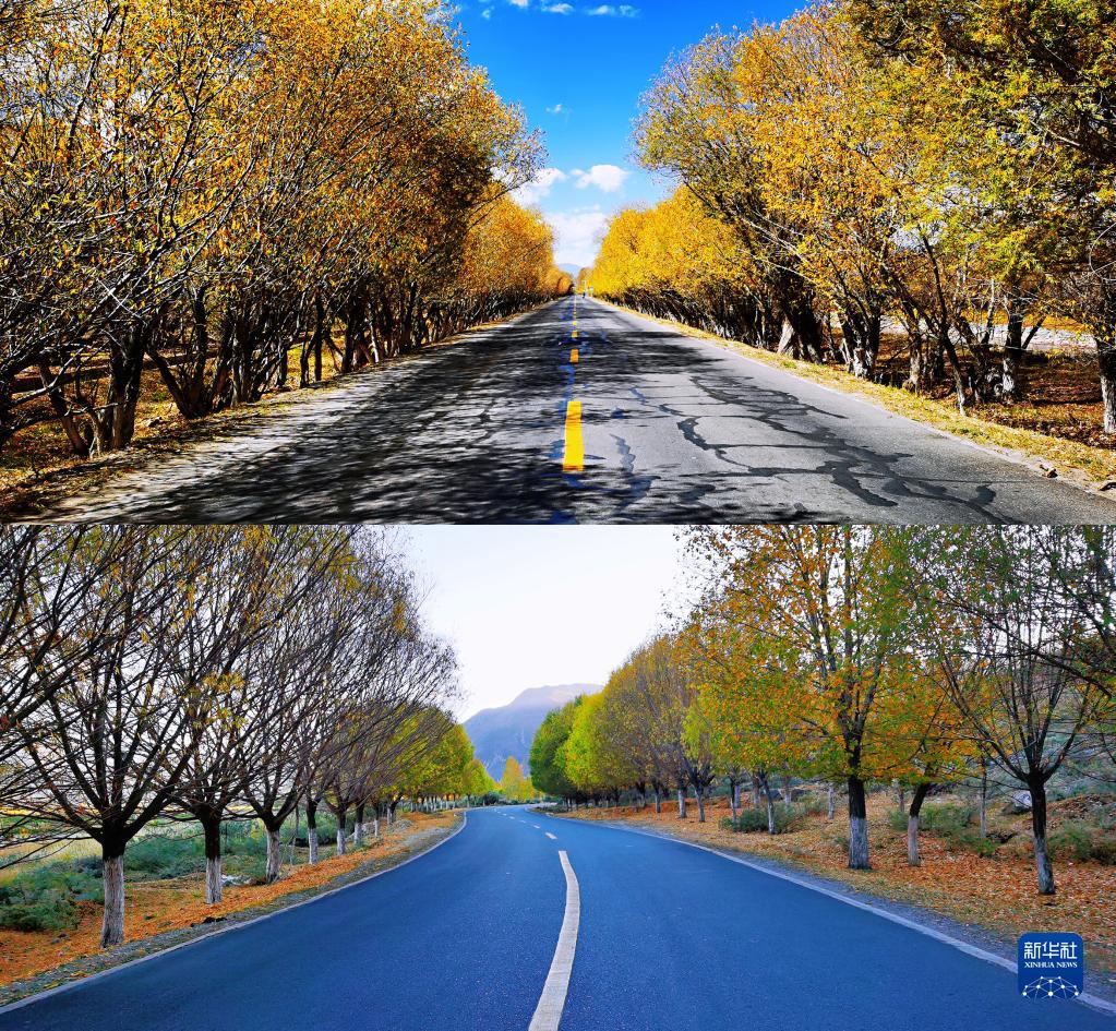 這是拉薩市林周縣的鄉(xiāng)村道路(手機拼版照片,2021年10月16日攝)。新華社記者 沈虹冰 攝
