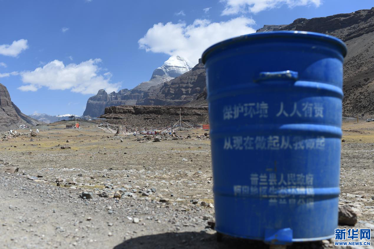 圖為岡仁波齊腳下添置的垃圾箱(4月20日攝)。新華網(wǎng) 旦增努布攝