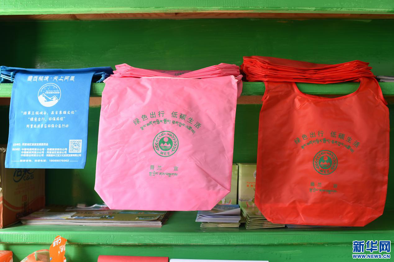 圖為“垃圾銀行”柜臺(tái)上擺放的環(huán)保袋(4月20日攝)。新華網(wǎng) 旦增努布攝