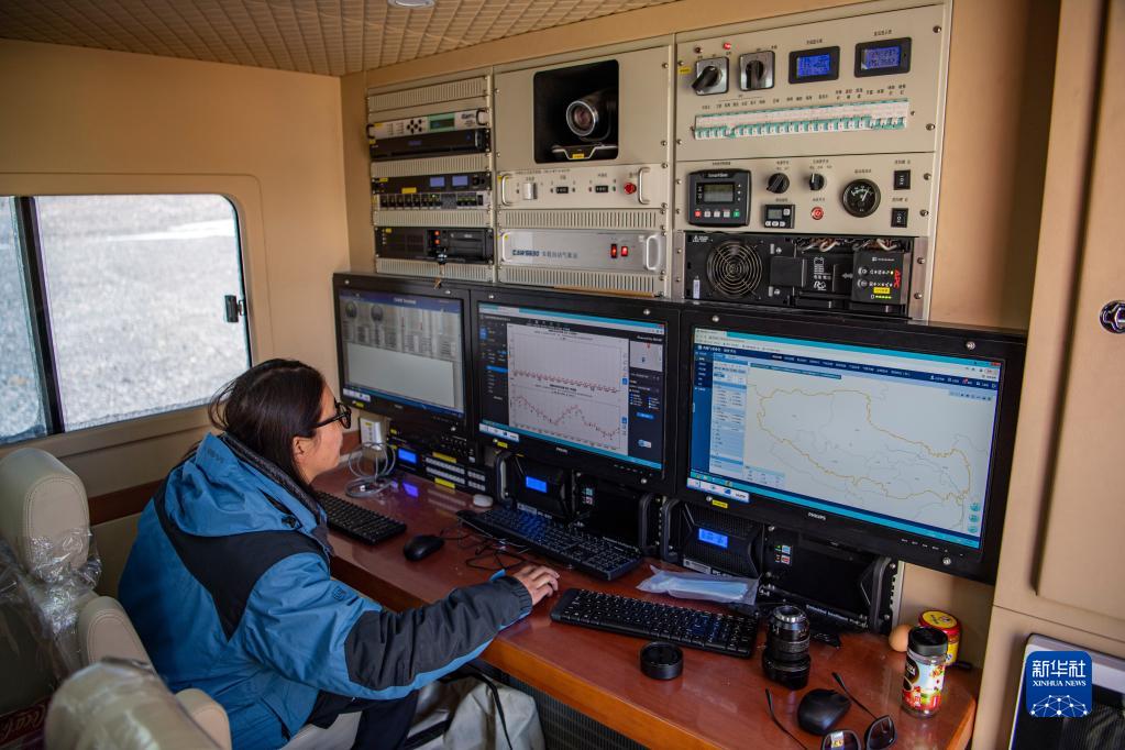 在珠峰登山大本營的氣象應(yīng)急保障車內(nèi),西藏自治區(qū)氣象局工作人員在查看實時氣象數(shù)據(jù)(5月3日攝)。新華社記者 孫非 攝