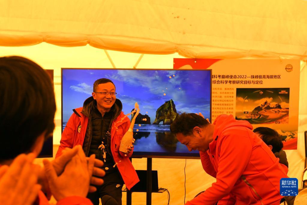 在珠峰腳下海拔5200米的總指揮會議室?guī)づ窭?,大家熱烈慶祝“巔峰使命”珠峰科考登頂觀測采樣成功(5月4日攝)。新華社記者 姜帆 攝