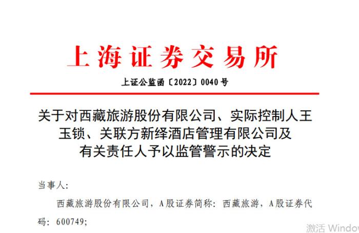 據(jù)上交所7日消息,因涉及非經(jīng)營性資金占用,且相關(guān)信息披露不真實(shí)、不準(zhǔn)確等,上交所決定對西藏旅游股份有限公司、實(shí)際控制人王玉鎖、關(guān)聯(lián)方新繹酒店管理有限公司及有關(guān)責(zé)任人予以監(jiān)管警示。