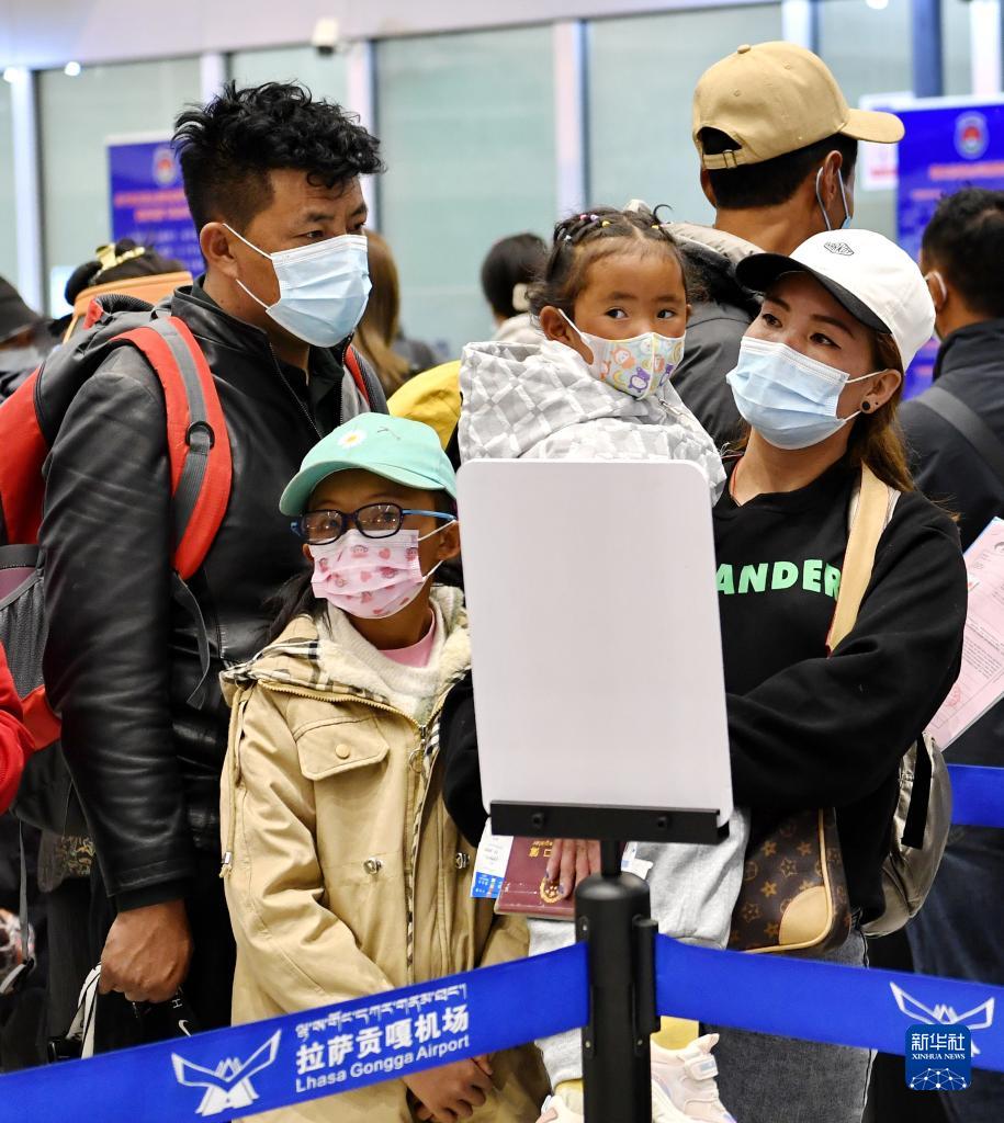 5月8日,在拉薩貢嘎機場,家長帶著患兒準備安檢登機。新華社記者 張汝鋒 攝
