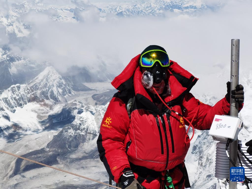 2022年5月4日,科考隊員在珠峰峰頂采集冰雪樣品。