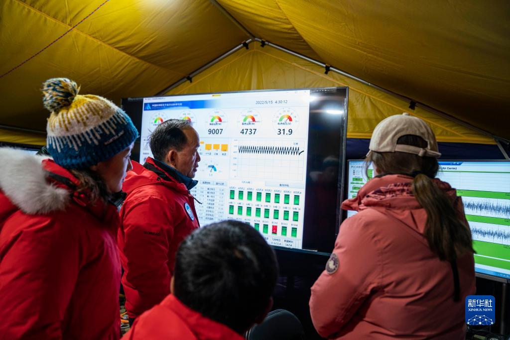 中科院院士、第二次青藏高原綜合科學考察研究隊隊長姚檀棟(左二)查看觀測儀器數據(5月15日 攝)。新華社記者 孫非 攝