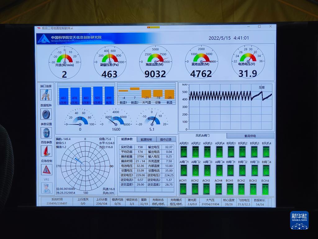 中國科學院空天信息創(chuàng)新研究院“極目一號”Ⅲ型浮空艇地面控制軟件顯示,浮空艇達到海拔9032米(5月15日 攝)。新華社記者 田金文 攝