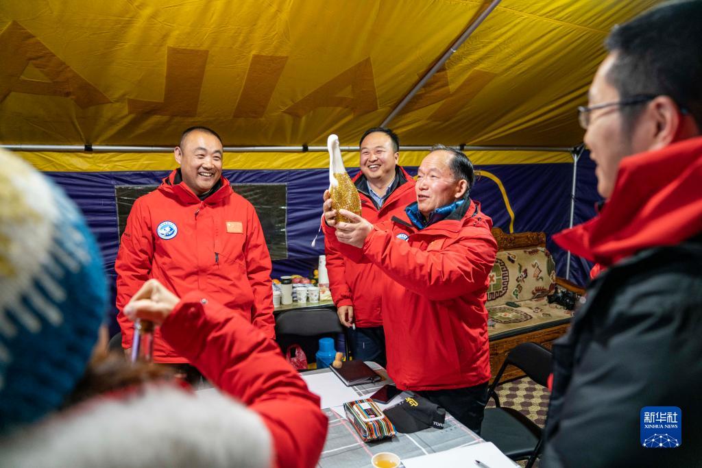 浮空艇創(chuàng)造紀錄后,科考隊員開香檳慶祝(5月15日 攝)。新華社記者 孫非 攝
