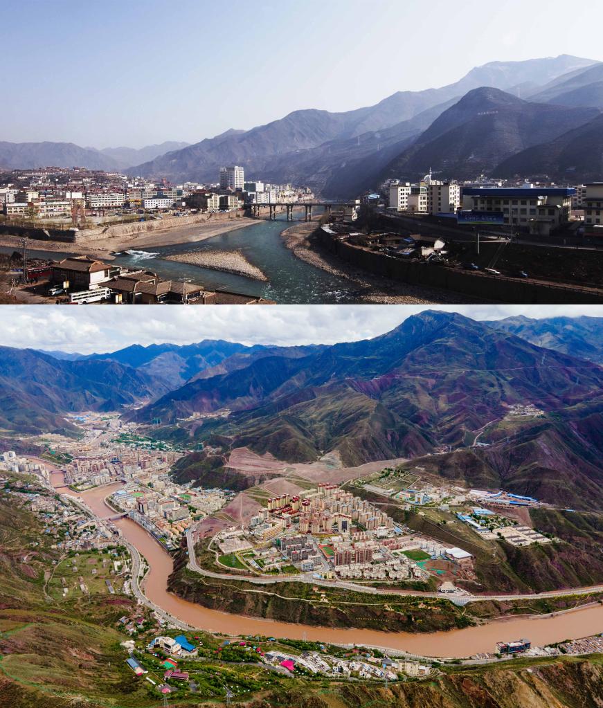 拼版照片:上圖是2009年3月13日拍攝的昌都(新華社記者 普布扎西 攝);下圖是2022年5月22日拍攝的昌都市卡若區(qū)(新華社記者 周荻瀟 攝,無人機(jī)照片)。新華社發(fā)