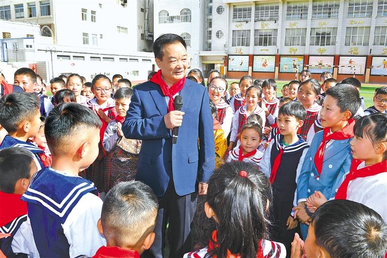 拉薩市第一小學(xué)是西藏和平解放后拉薩開(kāi)辦的第一所公立小學(xué)。今年將召開(kāi)黨的二十大,學(xué)校迎來(lái)建校70周年,這個(gè)主題隊(duì)日活動(dòng)格外有意義。上午9時(shí)30分許,王君正來(lái)到拉薩市第一小學(xué),朝氣蓬勃的少先隊(duì)員代表迎上前高聲問(wèn)好,并為王君正系上鮮艷的紅領(lǐng)巾,主動(dòng)牽著他的手走向校園。