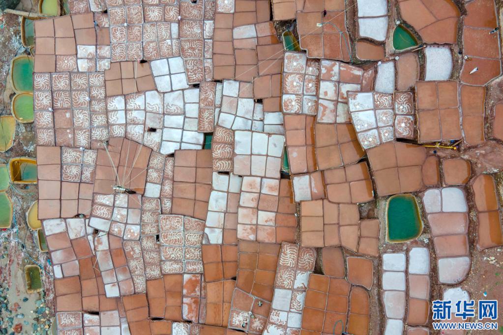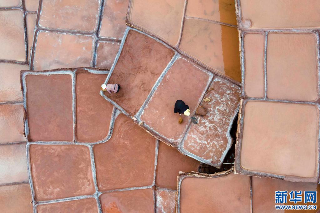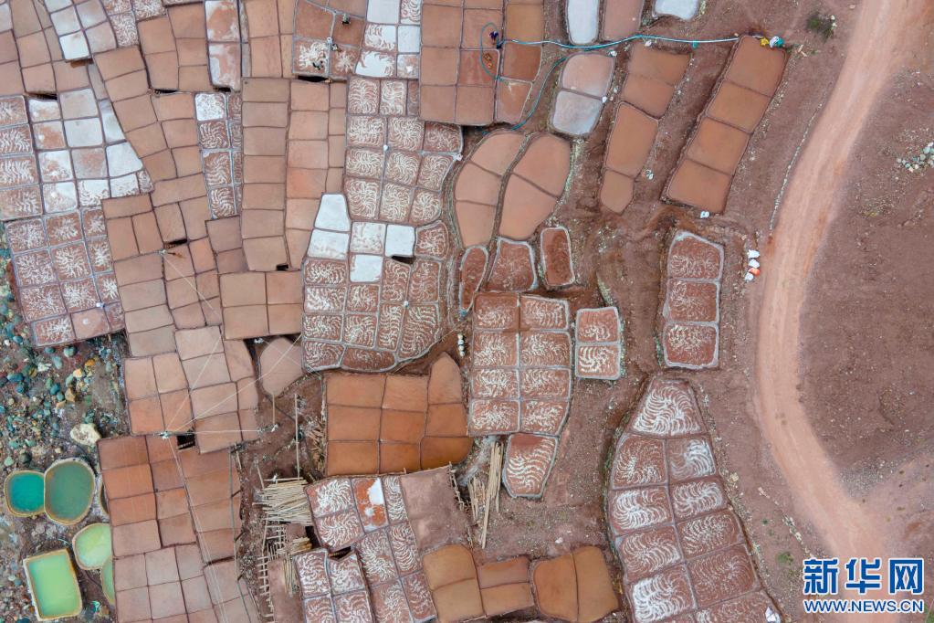 加達(dá)村村民在古鹽田里勞作(無人機照片,5月26日攝)。新華社記者 周荻瀟 攝