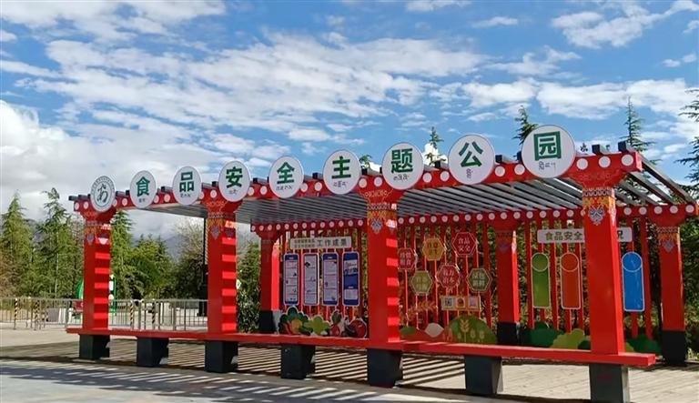 走進(jìn)公園,紅色的“食品安全主題公園”字牌映入眼簾,在中心步道位置標(biāo)示著食品安全主題標(biāo)語(yǔ)和拉薩市創(chuàng)建國(guó)家食品安全示范城市LOGO。中心步道兩側(cè)立著6塊展示牌,展示牌色彩鮮艷,背景造型有瓜果蔬菜、糌粑袋等,展示了“從農(nóng)田到餐桌 全程監(jiān)管守護(hù)百姓舌尖安全”“明廚亮灶”等內(nèi)容以及國(guó)家政策要求,對(duì)食品安全工作“最嚴(yán)謹(jǐn)?shù)臉?biāo)準(zhǔn)、最嚴(yán)謹(jǐn)?shù)谋O(jiān)管、最嚴(yán)謹(jǐn)?shù)奶幜P、最嚴(yán)謹(jǐn)?shù)膯?wèn)責(zé)”的標(biāo)準(zhǔn)主題語(yǔ)。
